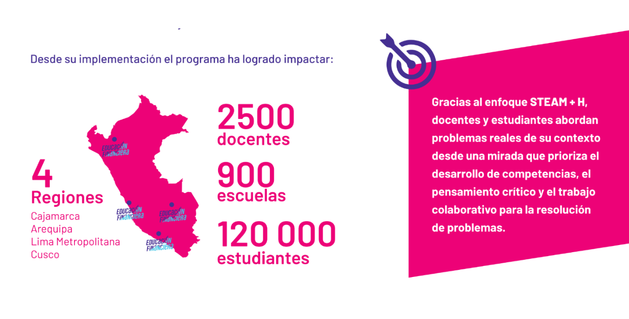 En solo dos años, “Educación Financiera en tu Cole” ha impactado a más de 117,000 alumnos y 2,500 maestros de 900 escuelas, y se probó que quienes pasan por el programa, en efecto mejoran sus competencias financieras. Actualmente, el programa se implementa en Arequipa, Cajamarca, Lima Metropolitana y Cusco, y existen planes de expansión a dos nuevas regiones para 2024-2025.