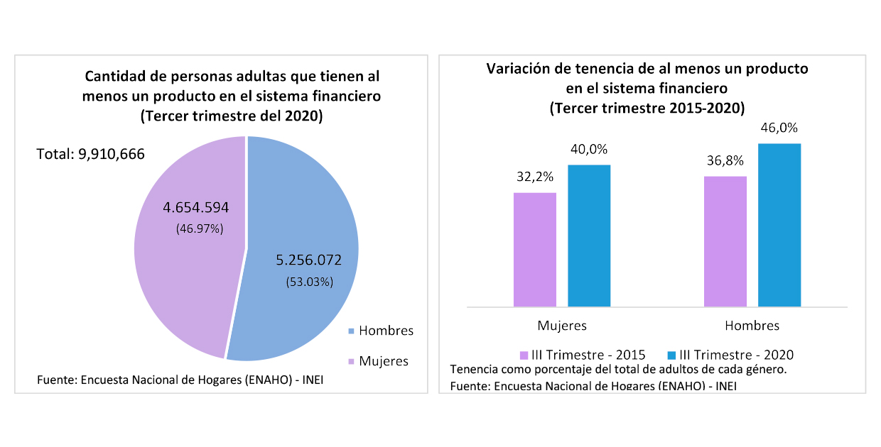 En el Perú, existe una tendencia hacia el crecimiento de mujeres con mayor acceso a los productos financieros que ofrece hoy el mercado. Según datos de la Encuesta Nacional de Hogares para el tercer trimestre del 2020, la cantidad de personas adultas que tienen al menos un producto en el sistema financiero - cuenta de ahorros, o cuenta a plazo, cuenta corriente, o tarjeta de crédito – alcanzó cerca de los 10 millones, donde el 47% son mujeres (4.6 millones).