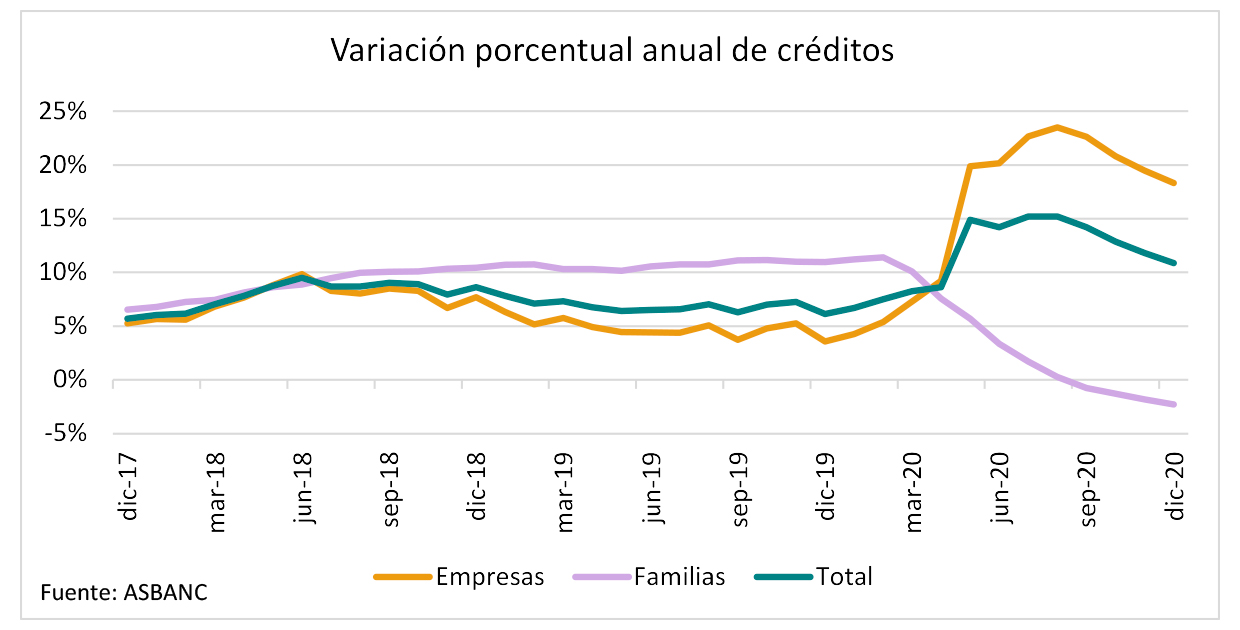 Es importante destacar que el programa Reactiva Perú garantizó un monto total de S/ 58,094 millones de créditos que beneficiaron a 547,108 empresas, de las cuales un 99% son medianas, micro y pequeñas empresas (MiPymes). Por lo tanto, Reactiva Perú permitió una mayor expansión del crédito de todos los segmentos empresariales. En el caso del segmento de MiPymes, los créditos crecieron en 37% en diciembre del 2020 respecto al año 2019, mientras que los créditos a grandes empresas y corporativos se elevaron a una tasa de 9.9%, respecto al año previo.