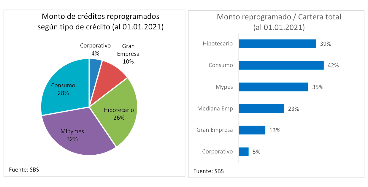 Asimismo, otra alternativa fueron las reprogramaciones, mecanismo que, a diferencia de los refinanciamientos y las reestructuraciones, se ofrecieron a los clientes que estaban al día al inicio de la pandemia, o que, como máximo, contaban con 15 días de atraso al cierre de febrero de 2020. Las reprogramaciones implican el otorgamiento de periodos de gracia, y la extensión del plazo total del crédito. Además, para el año 2020, las reprogramaciones involucraron una reducción de la tasa de interés efectiva, la no capitalización de intereses generados, condonación de cuotas, o combinaciones de dichas opciones que se tradujeron finalmente en la reducción del costo efectivo de los créditos.