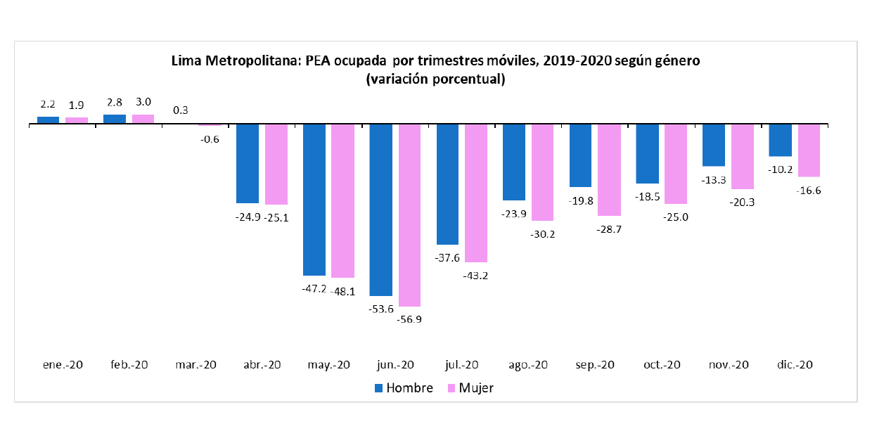 La crisis provocada por la pandemia del COVID-19 ha tenido un impacto negativo en la población, desencadenando pérdidas de empleos y reducción de salarios, siendo la población femenina la más afectada por el aumento de desempleo y pobreza. En ese sentido, la Organización Internacional de Trabajo menciona que existen una serie de factores que predisponen a las mujeres a caer aún más en la pobreza. Esta situación es posible observarla en el mayor impacto de pérdida de empleo en mujeres en nuestro país desde que empezó la pandemia.
