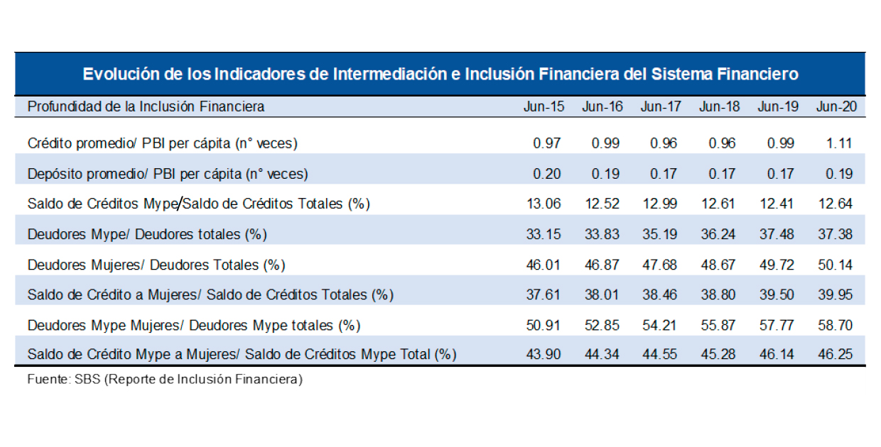 De acuerdo con el Reporte de Inclusión Financiera de la SBS, a junio del 2020, el número de deudoras mujeres llegó a 3.6 millones, representando el 50% respecto al total de deudores. Destaca de lejos el incremento gradual de deudores mype mujeres, que para junio del 2020 alcanzó los 1.6 millones y representó el 58.7% respecto al total. Si bien su participación en los saldos de crédito es menos significativa, llegando sólo al 40% en el crédito total y al 46% en el crédito mype, en ambos casos esta participación muestra una tendencia al alza, lo que refleja que la brecha de género en el acceso al crédito en el sistema financiero viene cerrándose.