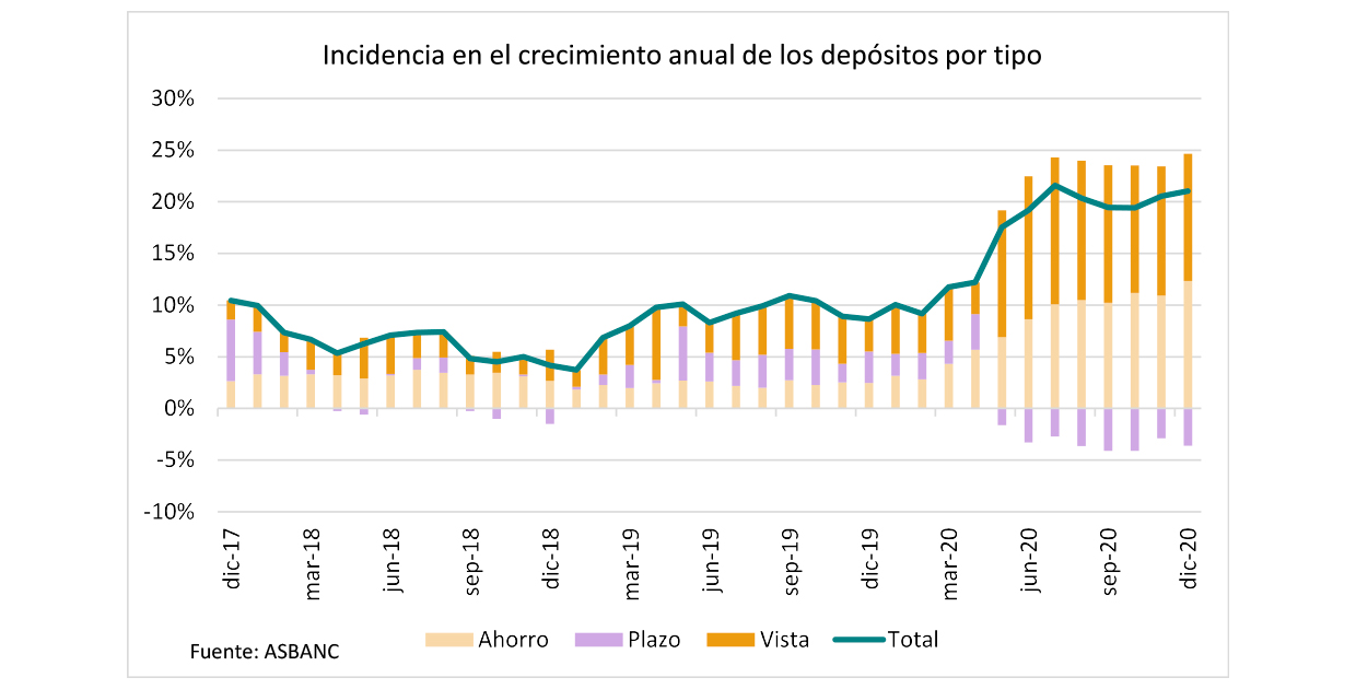 Por otro lado, el programa Reactiva Perú permitió que se canalizara una gran cantidad de recursos hacia la economía mediante el pago de proveedores, lo que se refleja en el avance de las cuentas a la vista, seguido del pago a trabajadores, lo que finalmente incide en el aumento de los depósitos de ahorro. Además, las medidas y normas emitidas permitieron un incremento de los excedentes de las personas -como la posibilidad de retirar fondos previsionales de las AFP, la disponibilidad parcial de fondos de CTS, y finalmente el pago de bonos de ayuda desplegado por el Gobierno a través del sistema financiero.